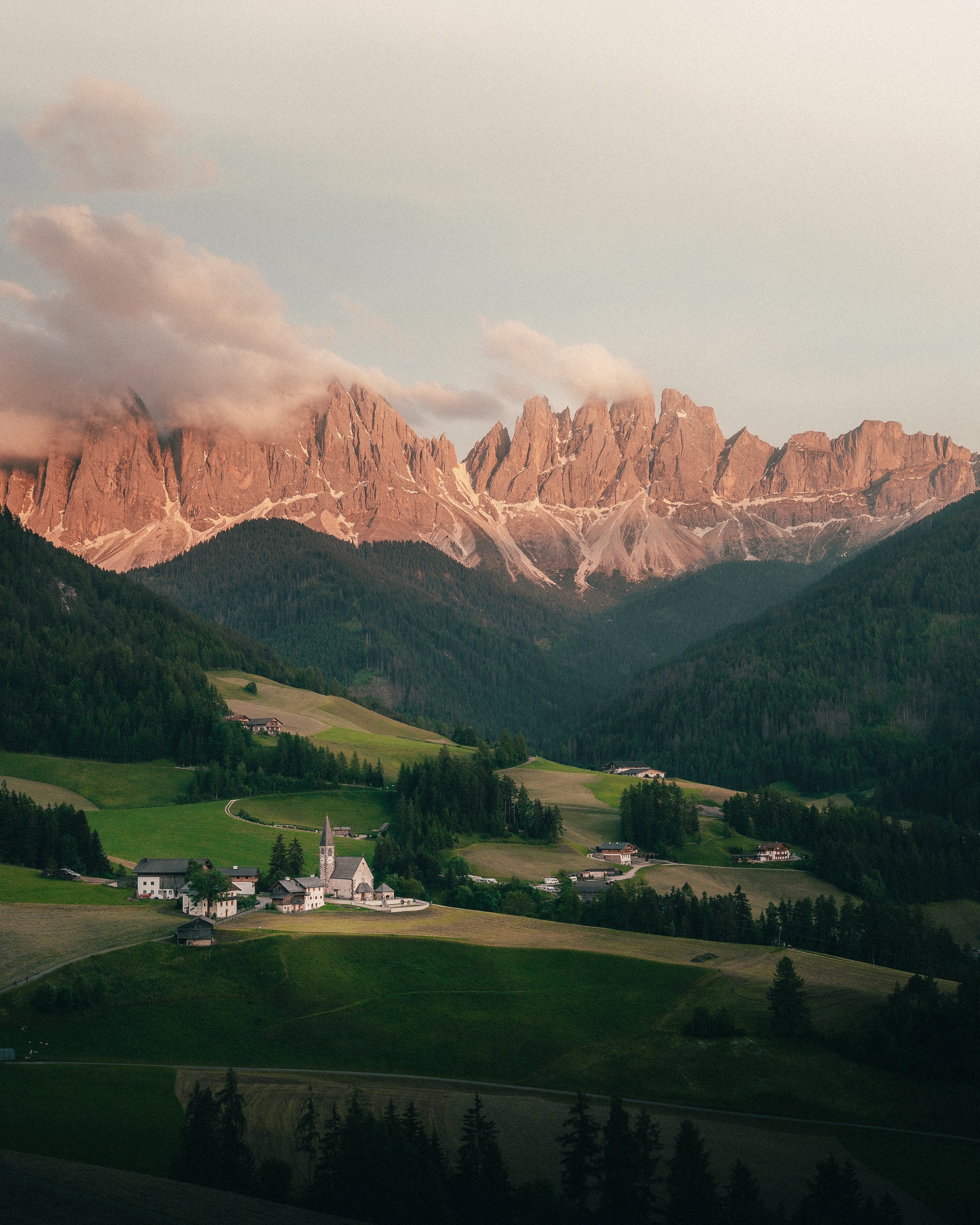 As the sun dipped behind the mountains, the small village of Santa Magdalena basked in a warm, golden light. The jagged peaks of the Dolomites rose dramatically in the background, their rugged beauty softened by clouds tinged with sunset hues. This serene scene captures the enchanting harmony of the village nestled within nature’s grandeur, where the day’s last light adds a touch of magic to the peaceful landscape.