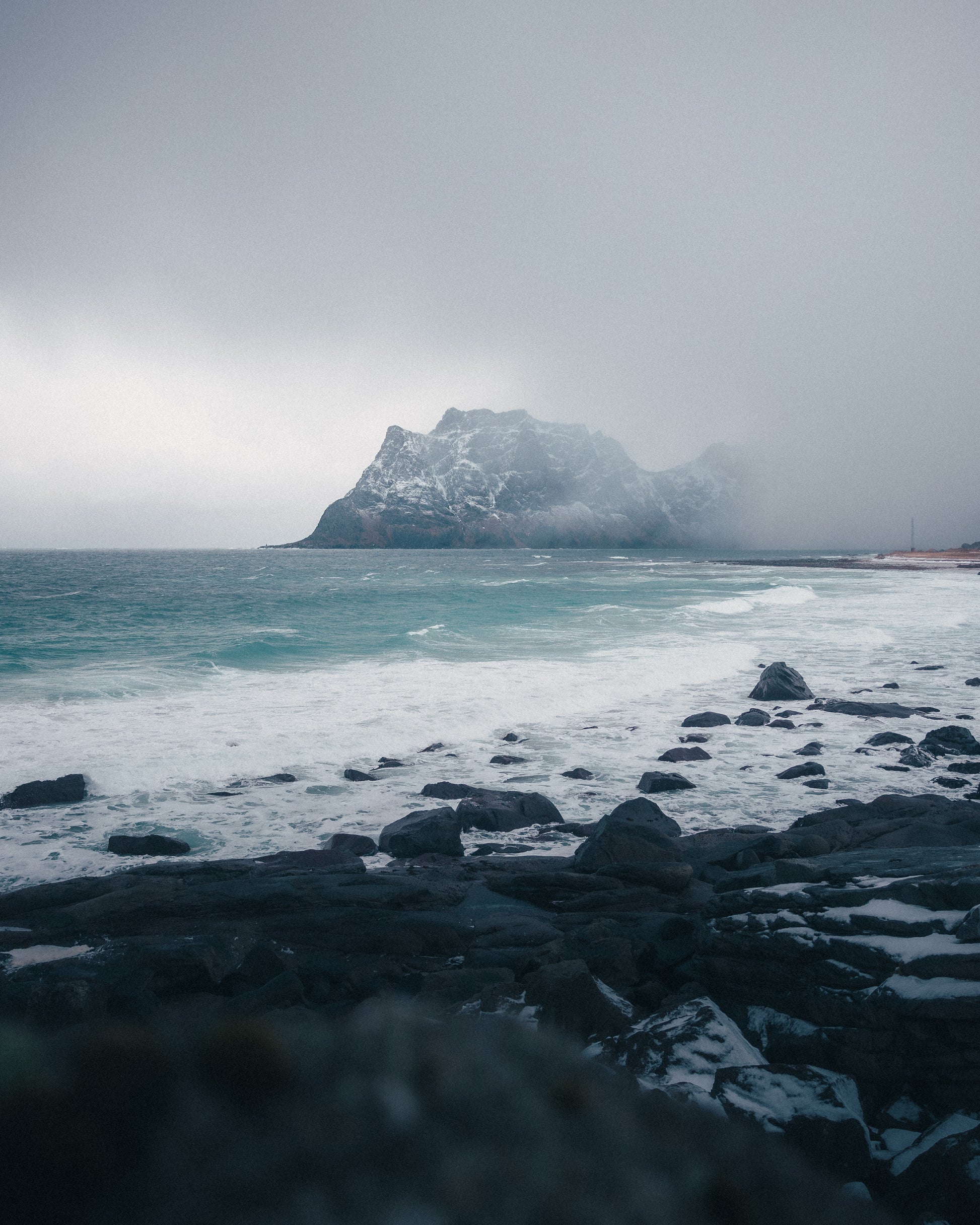 At Uttakleiv Beach, the raw power of nature was on full display. Fierce winds and snowstorms swept across the landscape, creating an atmosphere both harsh and captivating. The waves crashed against the rugged shore, while mist and snow partially veiled the distant mountains. This image captures the untamed spirit of the Lofoten Islands, where moments of intense weather reveal a rugged beauty shaped by the elements.